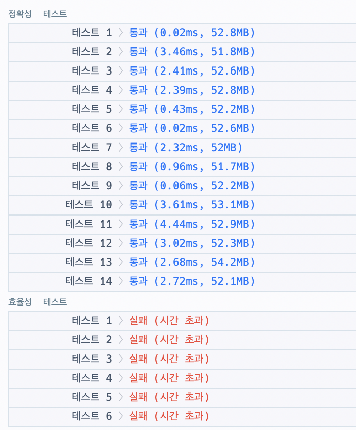 💡 while 반복문과 for 반복문을 사용해서 풀었다. 효율성 테스트에서 시간 초과가 나왔다.